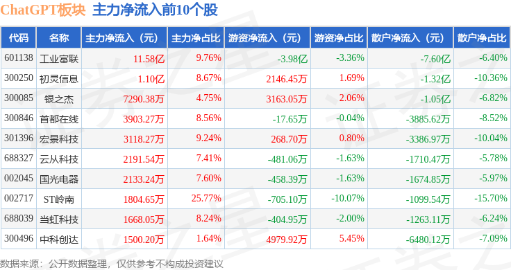 从资金流向上来看,当日ChatGPT板块主力资金净流入10.76亿元,游资资金净流出2.42亿元,散户资金净流出8.34亿元。ChatGPT板块个股资金流向见下表: