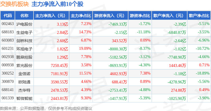 从资金流向上来看,当日交换机板块主力资金净流入11.93亿元,游资资金净流出5.07亿元,散户资金净流出6.86亿元。交换机板块个股资金流向见下表: