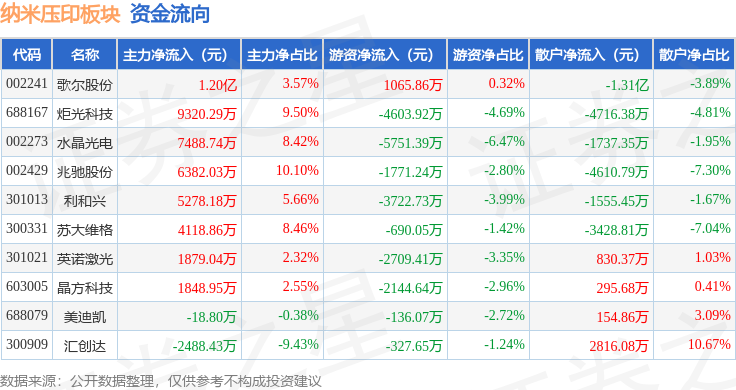 从资金流向上来看,当日纳米压印板块主力资金净流入4.58亿元,游资资金净流出2.08亿元,散户资金净流出2.5亿元。纳米压印板块个股资金流向见下表: