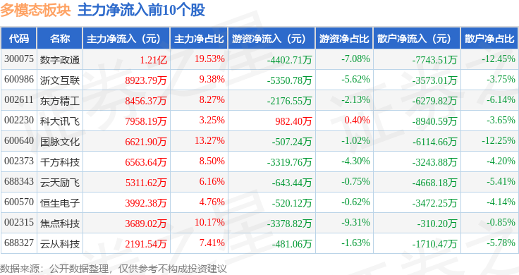 从资金流向上来看,当日多模态板块主力资金净流出5.7亿元,游资资金净流入8585.07万元,散户资金净流入4.84亿元。多模态板块个股资金流向见下表: