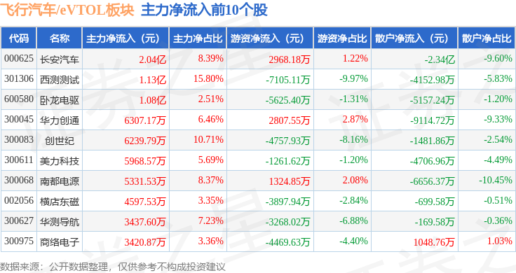 从资金流向上来看,当日飞行汽车/eVTOL板块主力资金净流入1.86亿元,游资资金净流出6.71亿元,散户资金净流入4.85亿元。飞行汽车/eVTOL板块个股资金流向见下表: