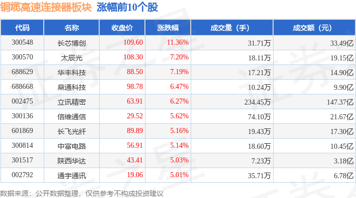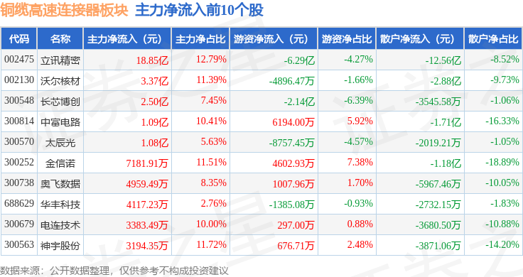 从资金流向上来看,当日铜缆高速连接器板块主力资金净流入30.62亿元,游资资金净流出11.27亿元,散户资金净流出19.35亿元。铜缆高速连接器板块个股资金流向见下表: