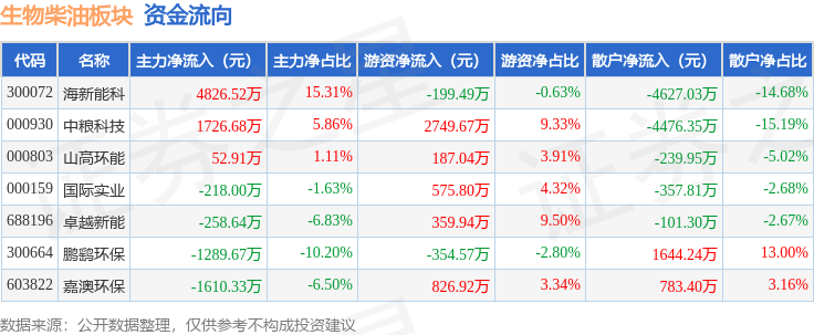 从资金流向上来看,当日生物柴油板块主力资金净流入3229.48万元,游资资金净流入4145.31万元,散户资金净流出7374.8万元。生物柴油板块个股资金流向见下表:
