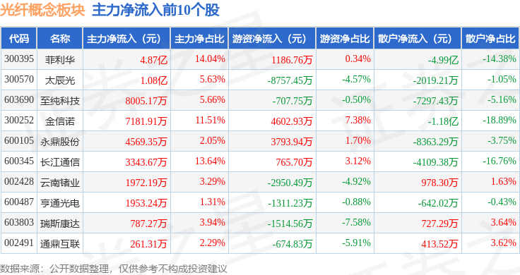 从资金流向上来看,当日光纤概念板块主力资金净流入5.99亿元,游资资金净流出4826.37万元,散户资金净流出5.51亿元。光纤概念板块个股资金流向见下表:
