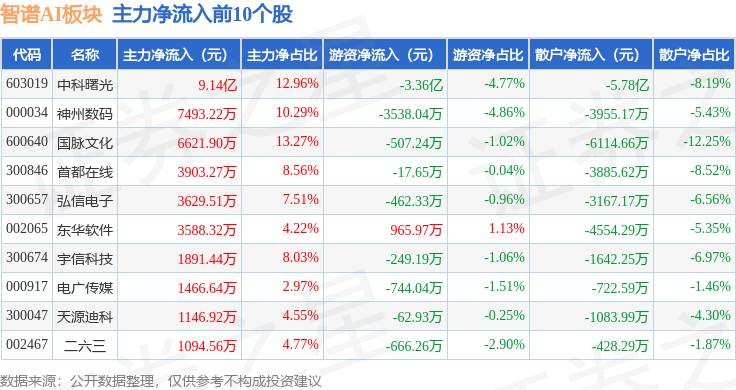 从资金流向上来看,当日智谱AI板块主力资金净流入7.62亿元,游资资金净流出3.95亿元,散户资金净流出3.67亿元。智谱AI板块个股资金流向见下表: