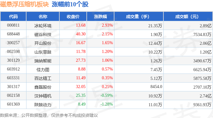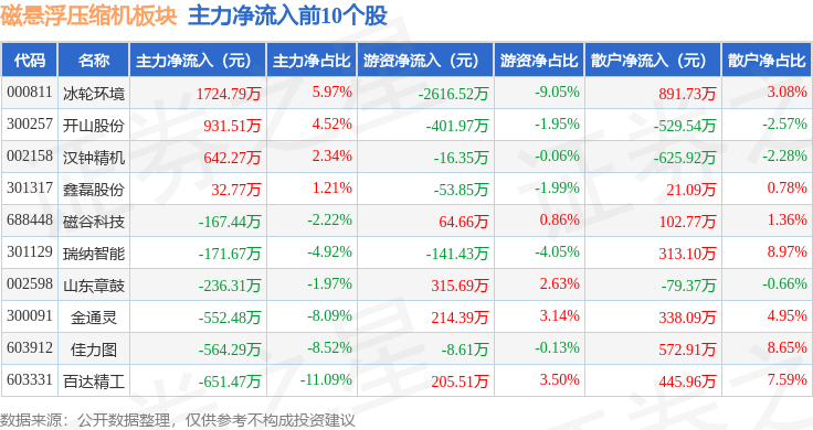 从资金流向上来看,当日磁悬浮压缩机板块主力资金净流出1.5亿元,游资资金净流出1270.96万元,散户资金净流入1.63亿元。磁悬浮压缩机板块个股资金流向见下表: