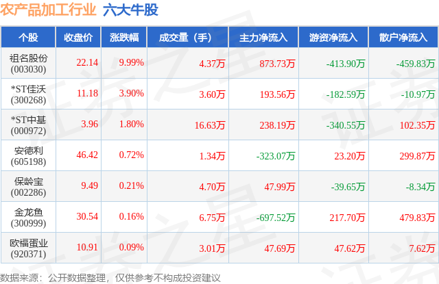 个股表现方面,农产品加工行业当日领涨股为祖名股份(003030),该股当日报收22.14,上涨9.99%,成交量4.37万,主力资金净流入873.73万元。*ST佳沃(300268)以上涨3.9%紧随其后,该股当日成交量3.6万,主力资金净流入193.56万元。除此之外,*ST中基(000972)、安德利(605198)、保龄宝(002286)均进入当日牛股之列。具体个股列表见下表: