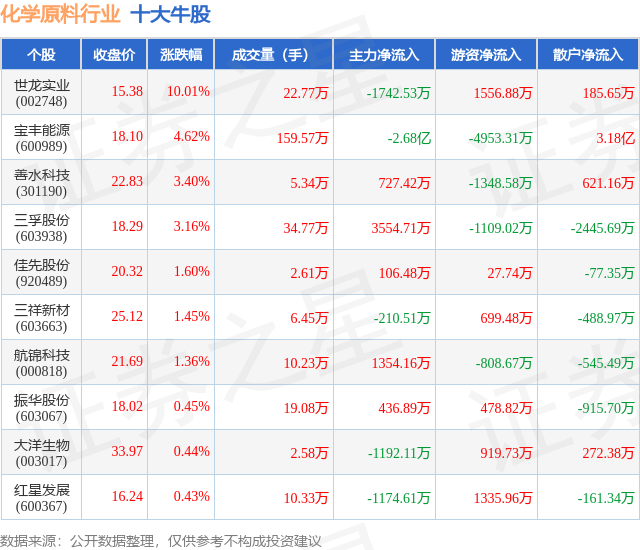 个股表现方面,化学原料行业当日领涨股为世龙实业(002748),该股当日报收15.38,上涨10.01%,成交量22.77万,主力资金净流出1742.53万元。宝丰能源(600989)以上涨4.62%紧随其后,该股当日成交量159.57万,主力资金净流出2.68亿元。除此之外,善水科技(301190)、三孚股份(603938)、佳先股份(920489)均进入当日牛股之列。具体个股列表见下表: