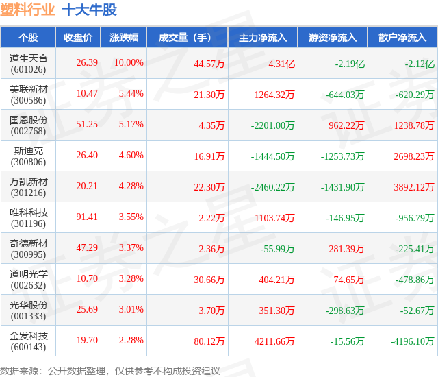 个股表现方面,塑料行业当日领涨股为道生天合(601026),该股当日报收26.39,上涨10.0%,成交量44.57万,主力资金净流入4.31亿元。美联新材(300586)以上涨5.44%紧随其后,该股当日成交量21.3万,主力资金净流入1264.32万元。除此之外,国恩股份(002768)、斯迪克(300806)、万凯新材(301216)均进入当日牛股之列。具体个股列表见下表: