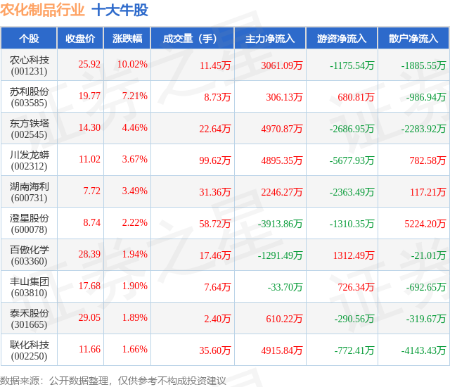 个股表现方面,农化制品行业当日领涨股为农心科技(001231),该股当日报收25.92,上涨10.02%,成交量11.45万,主力资金净流入3061.09万元。苏利股份(603585)以上涨7.21%紧随其后,该股当日成交量8.73万,主力资金净流入306.13万元。除此之外,东方铁塔(002545)、川发龙蟒(002312)、湖南海利(600731)均进入当日牛股之列。具体个股列表见下表: