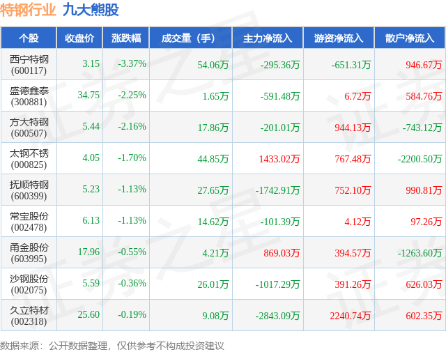 个股表现方面,特钢行业当日领跌股为西宁特钢(600117),该股当日报收3.15,下跌3.37%,成交量54.06万,主力资金净流出295.36万元。盛德鑫泰(300881)以下跌2.25%紧随其后,该股当日成交量1.65万,主力资金净流出591.48万元。除此之外,方大特钢(600507)、太钢不锈(000825)、抚顺特钢(600399)均进入当日熊股之列。具体个股列表见下表: