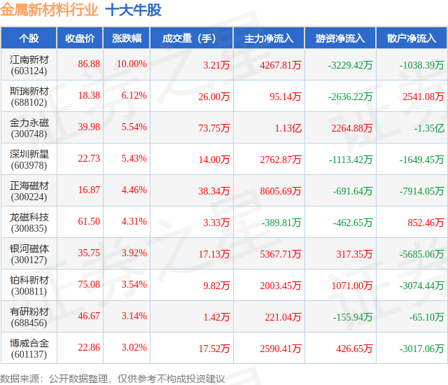 个股表现方面,金属新材料行业当日领涨股为江南新材(603124),该股当日报收86.88,上涨10.0%,成交量3.21万,主力资金净流入4267.81万元。斯瑞新材(688102)以上涨6.12%紧随其后,该股当日成交量26.0万,主力资金净流入95.14万元。除此之外,金力永磁(300748)、深圳新星(603978)、正海磁材(300224)均进入当日牛股之列。具体个股列表见下表: