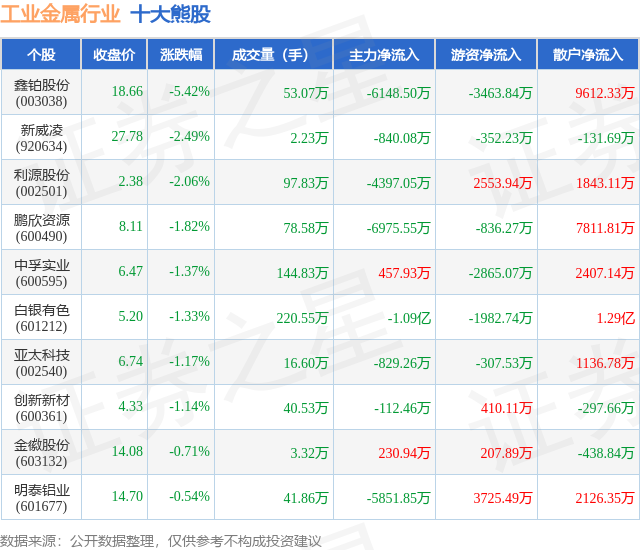 个股表现方面,工业金属行业当日领跌股为鑫铂股份(003038),该股当日报收18.66,下跌5.42%,成交量53.07万,主力资金净流出6148.5万元。新威凌(920634)以下跌2.49%紧随其后,该股当日成交量2.23万,主力资金净流出840.08万元。除此之外,利源股份(002501)、鹏欣资源(600490)、中孚实业(600595)均进入当日熊股之列。具体个股列表见下表: