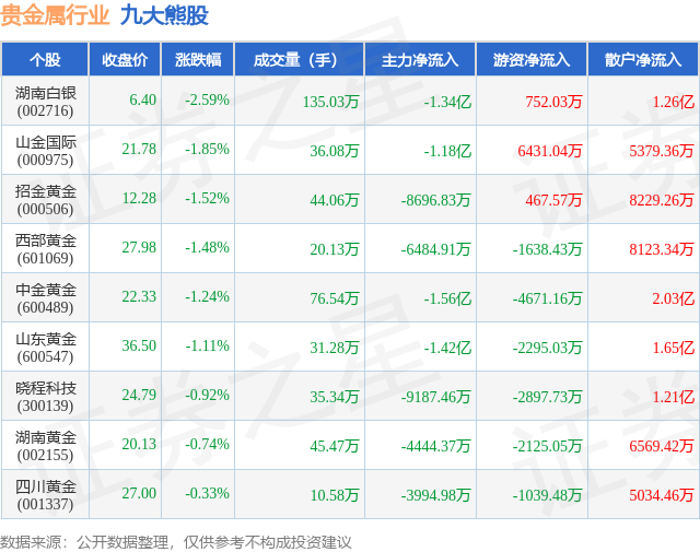 个股表现方面,贵金属行业当日领跌股为湖南白银(002716),该股当日报收6.4,下跌2.59%,成交量135.03万,主力资金净流出1.34亿元。山金国际(000975)以下跌1.85%紧随其后,该股当日成交量36.08万,主力资金净流出1.18亿元。除此之外,招金黄金(000506)、西部黄金(601069)、中金黄金(600489)均进入当日熊股之列。具体个股列表见下表: