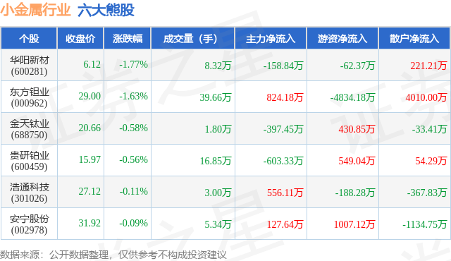 个股表现方面,小金属行业当日领跌股为华阳新材(600281),该股当日报收6.12,下跌1.77%,成交量8.32万,主力资金净流出158.84万元。东方钽业(000962)以下跌1.63%紧随其后,该股当日成交量39.66万,主力资金净流入824.18万元。除此之外,金天钛业(688750)、贵研铂业(600459)、浩通科技(301026)均进入当日熊股之列。具体个股列表见下表: