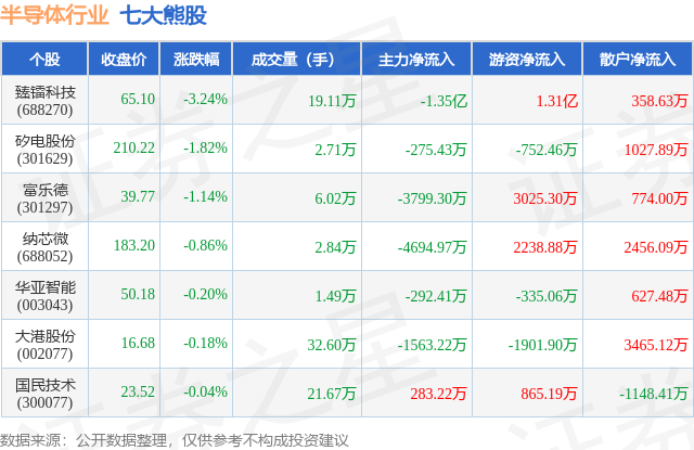 个股表现方面,半导体行业当日领跌股为臻镭科技(688270),该股当日报收65.1,下跌3.24%,成交量19.11万,主力资金净流出1.35亿元。矽电股份(301629)以下跌1.82%紧随其后,该股当日成交量2.71万,主力资金净流出275.43万元。除此之外,富乐德(301297)、纳芯微(688052)、华亚智能(003043)均进入当日熊股之列。具体个股列表见下表: