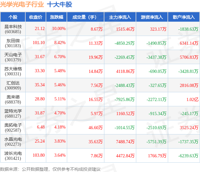 个股表现方面,光学光电子行业当日领涨股为晨丰科技(603685),该股当日报收21.12,上涨10.0%,成交量8.67万,主力资金净流入1515.46万元。东田微(301183)以上涨8.42%紧随其后,该股当日成交量11.33万,主力资金净流出4850.29万元。除此之外,天山电子(301379)、苏大维格(300331)、汇创达(300909)均进入当日牛股之列。具体个股列表见下表: