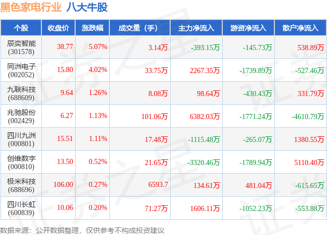 个股表现方面,黑色家电行业当日领涨股为辰奕智能(301578),该股当日报收38.77,上涨5.07%,成交量3.14万,主力资金净流出393.15万元。同洲电子(002052)以上涨4.02%紧随其后,该股当日成交量33.75万,主力资金净流入2267.35万元。除此之外,九联科技(688609)、兆驰股份(002429)、四川九洲(000801)均进入当日牛股之列。具体个股列表见下表: