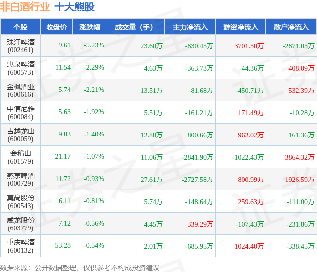 个股表现方面,非白酒行业当日领跌股为珠江啤酒(002461),该股当日报收9.61,下跌5.23%,成交量23.6万,主力资金净流出830.45万元。惠泉啤酒(600573)以下跌2.29%紧随其后,该股当日成交量4.63万,主力资金净流出363.73万元。除此之外,金枫酒业(600616)、中信尼雅(600084)、古越龙山(600059)均进入当日熊股之列。具体个股列表见下表: