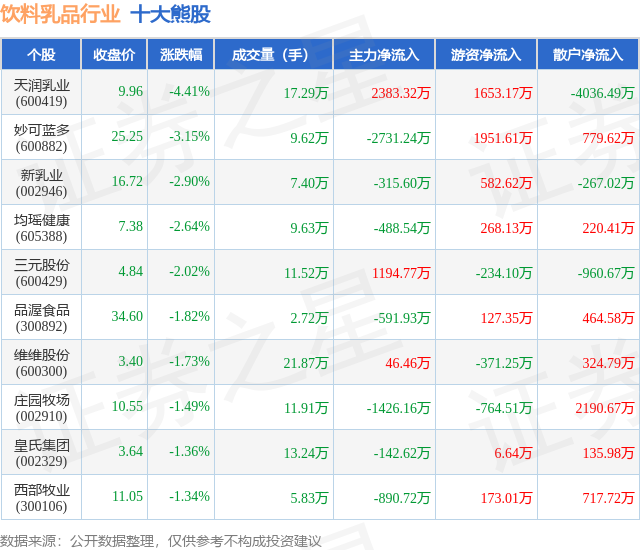 个股表现方面,饮料乳品行业当日领跌股为天润乳业(600419),该股当日报收9.96,下跌4.41%,成交量17.29万,主力资金净流入2383.32万元。妙可蓝多(600882)以下跌3.15%紧随其后,该股当日成交量9.62万,主力资金净流出2731.24万元。除此之外,新乳业(002946)、均瑶健康(605388)、三元股份(600429)均进入当日熊股之列。具体个股列表见下表: