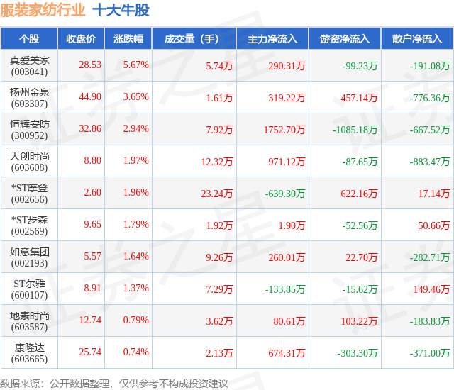 个股表现方面,服装家纺行业当日领涨股为真爱美家(003041),该股当日报收28.53,上涨5.67%,成交量5.74万,主力资金净流入290.31万元。扬州金泉(603307)以上涨3.65%紧随其后,该股当日成交量1.61万,主力资金净流入319.22万元。除此之外,恒辉安防(300952)、天创时尚(603608)、*ST摩登(002656)均进入当日牛股之列。具体个股列表见下表: