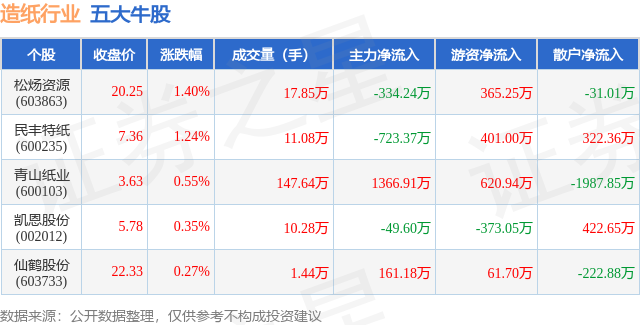 个股表现方面,造纸行业当日领涨股为松炀资源(603863),该股当日报收20.25,上涨1.4%,成交量17.85万,主力资金净流出334.24万元。民丰特纸(600235)以上涨1.24%紧随其后,该股当日成交量11.08万,主力资金净流出723.37万元。除此之外,青山纸业(600103)、凯恩股份(002012)、仙鹤股份(603733)均进入当日牛股之列。具体个股列表见下表: