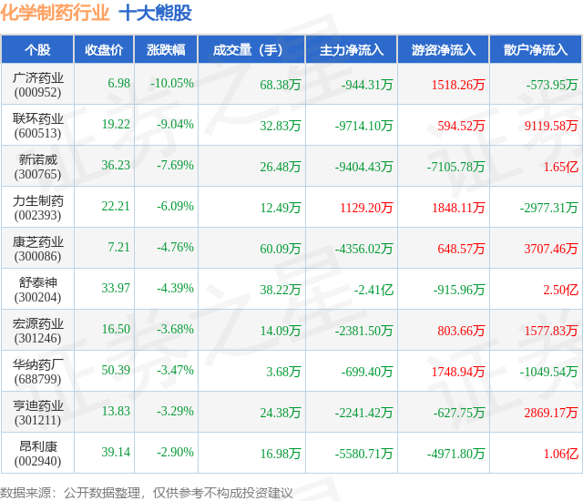 个股表现方面,化学制药行业当日领跌股为广济药业(000952),该股当日报收6.98,下跌10.05%,成交量68.38万,主力资金净流出944.31万元。联环药业(600513)以下跌9.04%紧随其后,该股当日成交量32.83万,主力资金净流出9714.1万元。除此之外,新诺威(300765)、力生制药(002393)、康芝药业(300086)均进入当日熊股之列。具体个股列表见下表: