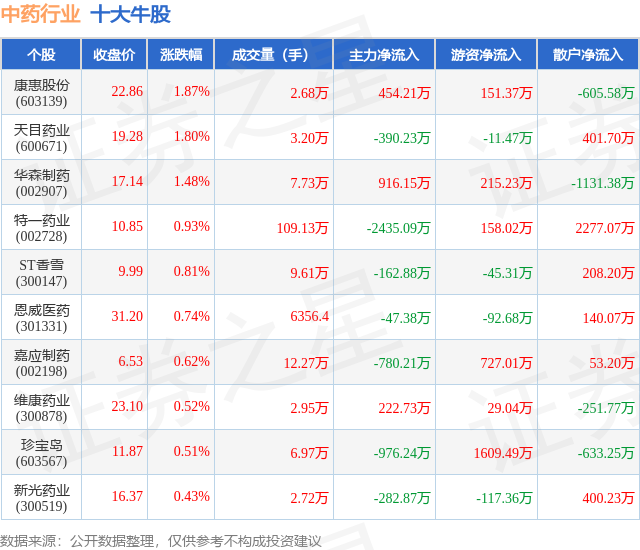 个股表现方面,中药行业当日领涨股为康惠股份(603139),该股当日报收22.86,上涨1.87%,成交量2.68万,主力资金净流入454.21万元。天目药业(600671)以上涨1.8%紧随其后,该股当日成交量3.2万,主力资金净流出390.23万元。除此之外,华森制药(002907)、特一药业(002728)、ST香雪(300147)均进入当日牛股之列。具体个股列表见下表: