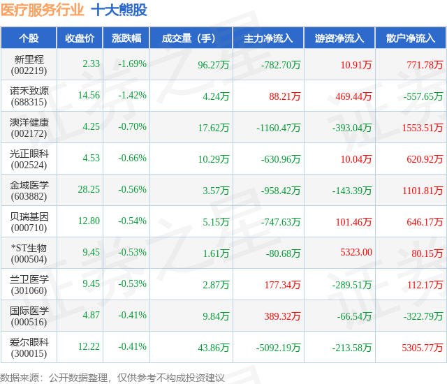 个股表现方面,医疗服务行业当日领跌股为新里程(002219),该股当日报收2.33,下跌1.69%,成交量96.27万,主力资金净流出782.7万元。诺禾致源(688315)以下跌1.42%紧随其后,该股当日成交量4.24万,主力资金净流入88.21万元。除此之外,澳洋健康(002172)、光正眼科(002524)、金域医学(603882)均进入当日熊股之列。具体个股列表见下表: