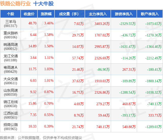 个股表现方面,铁路公路行业当日领涨股为三羊马(001317),该股当日报收48.7,上涨3.46%,成交量7.02万,主力资金净流入3403.2万元。重庆路桥(600106)以上涨1.58%紧随其后,该股当日成交量29.75万,主力资金净流入1707.02万元。除此之外,皖通高速(600012)、龙江交通(601188)、粤高速A(000429)均进入当日牛股之列。具体个股列表见下表: