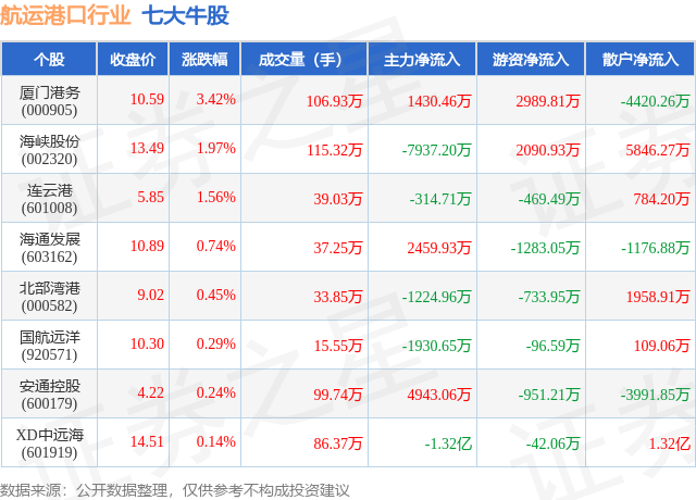 个股表现方面,航运港口行业当日领涨股为厦门港务(000905),该股当日报收10.59,上涨3.42%,成交量106.93万,主力资金净流入1430.46万元。海峡股份(002320)以上涨1.97%紧随其后,该股当日成交量115.32万,主力资金净流出7937.2万元。除此之外,连云港(601008)、海通发展(603162)、北部湾港(000582)均进入当日牛股之列。具体个股列表见下表: