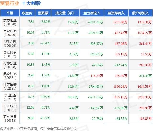个股表现方面,贸易行业当日领跌股为东方创业(600278),该股当日报收7.81,下跌3.82%,成交量17.6万,主力资金净流出2671.34万元。南京商旅(600250)以下跌3.71%紧随其后,该股当日成交量15.33万,主力资金净流出2021.65万元。除此之外,*ST沪科(600608)、苏豪时尚(600287)、苏豪弘业(600128)均进入当日熊股之列。具体个股列表见下表: