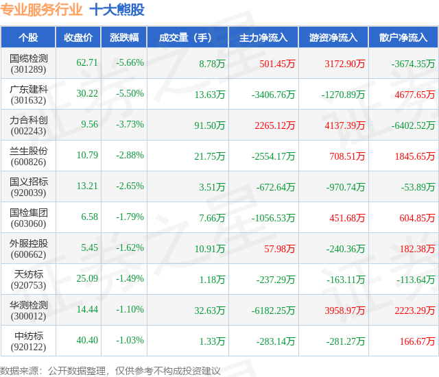 个股表现方面,专业服务行业当日领跌股为国缆检测(301289),该股当日报收62.71,下跌5.66%,成交量8.78万,主力资金净流入501.45万元。广东建科(301632)以下跌5.5%紧随其后,该股当日成交量13.63万,主力资金净流出3406.76万元。除此之外,力合科创(002243)、兰生股份(600826)、国义招标(920039)均进入当日熊股之列。具体个股列表见下表: