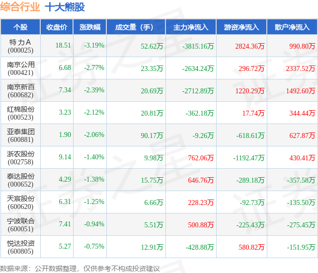 个股表现方面,综合行业当日领跌股为特 力A(000025),该股当日报收18.51,下跌3.19%,成交量52.62万,主力资金净流出3815.16万元。南京公用(000421)以下跌2.77%紧随其后,该股当日成交量23.35万,主力资金净流出2634.24万元。除此之外,南京新百(600682)、红棉股份(000523)、亚泰集团(600881)均进入当日熊股之列。具体个股列表见下表: