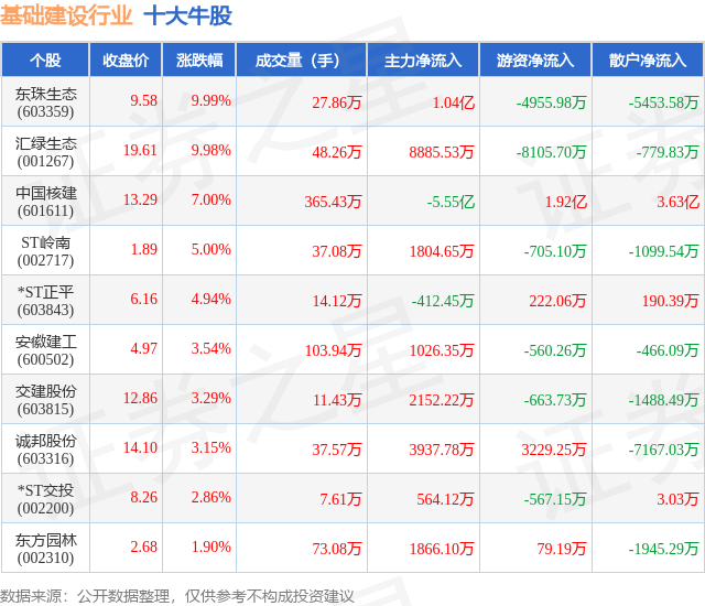个股表现方面,基础建设行业当日领涨股为东珠生态(603359),该股当日报收9.58,上涨9.99%,成交量27.86万,主力资金净流入1.04亿元。汇绿生态(001267)以上涨9.98%紧随其后,该股当日成交量48.26万,主力资金净流入8885.53万元。除此之外,中国核建(601611)、ST岭南(002717)、*ST正平(603843)均进入当日牛股之列。具体个股列表见下表: