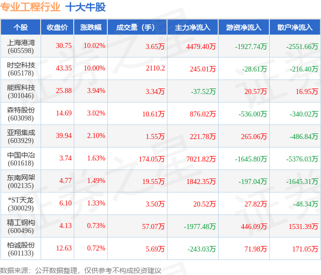 个股表现方面,专业工程行业当日领涨股为上海港湾(605598),该股当日报收30.75,上涨10.02%,成交量3.65万,主力资金净流入4479.4万元。时空科技(605178)以上涨10.0%紧随其后,该股当日成交量2110.0,主力资金净流入245.01万元。除此之外,能辉科技(301046)、森特股份(603098)、亚翔集成(603929)均进入当日牛股之列。具体个股列表见下表: