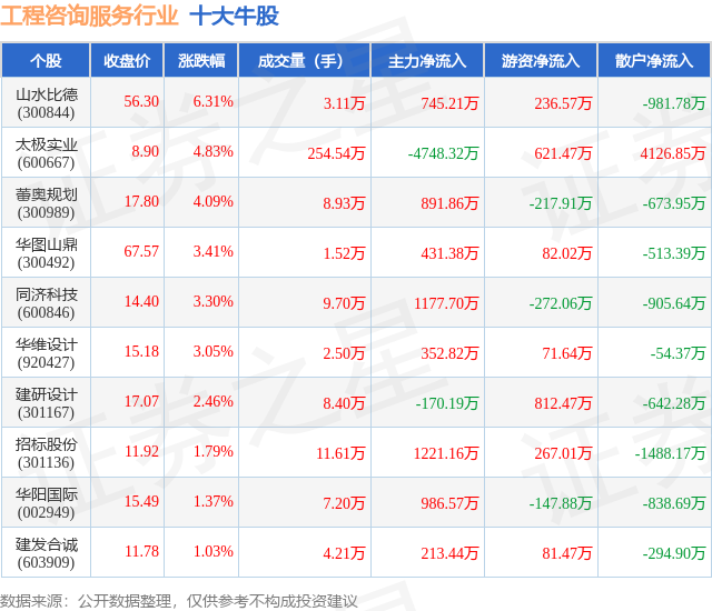 个股表现方面,工程咨询服务行业当日领涨股为山水比德(300844),该股当日报收56.3,上涨6.31%,成交量3.11万,主力资金净流入745.21万元。太极实业(600667)以上涨4.83%紧随其后,该股当日成交量254.54万,主力资金净流出4748.32万元。除此之外,蕾奥规划(300989)、华图山鼎(300492)、同济科技(600846)均进入当日牛股之列。具体个股列表见下表: