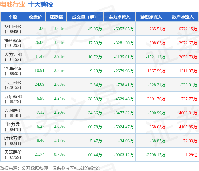 个股表现方面,电池行业当日领跌股为华自科技(300490),该股当日报收11.0,下跌3.68%,成交量45.05万,主力资金净流出6957.65万元。海科新源(301292)以下跌3.63%紧随其后,该股当日成交量17.5万,主力资金净流出3281.3万元。除此之外,天力锂能(301152)、滨海能源(000695)、昆工科技(920152)均进入当日熊股之列。具体个股列表见下表:
