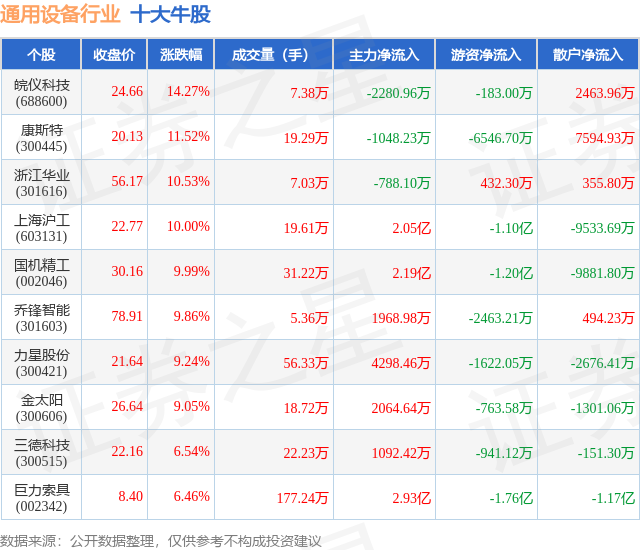 个股表现方面,通用设备行业当日领涨股为皖仪科技(688600),该股当日报收24.66,上涨14.27%,成交量7.38万,主力资金净流出2280.96万元。康斯特(300445)以上涨11.52%紧随其后,该股当日成交量19.29万,主力资金净流出1048.23万元。除此之外,浙江华业(301616)、上海沪工(603131)、国机精工(002046)均进入当日牛股之列。具体个股列表见下表: