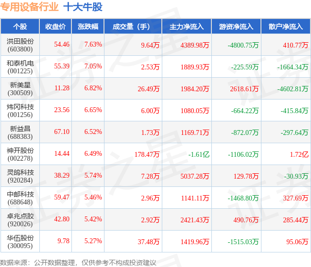 个股表现方面,专用设备行业当日领涨股为洪田股份(603800),该股当日报收54.46,上涨7.63%,成交量9.64万,主力资金净流入4389.98万元。和泰机电(001225)以上涨7.05%紧随其后,该股当日成交量2.53万,主力资金净流入1889.93万元。除此之外,新美星(300509)、炜冈科技(001256)、新益昌(688383)均进入当日牛股之列。具体个股列表见下表: