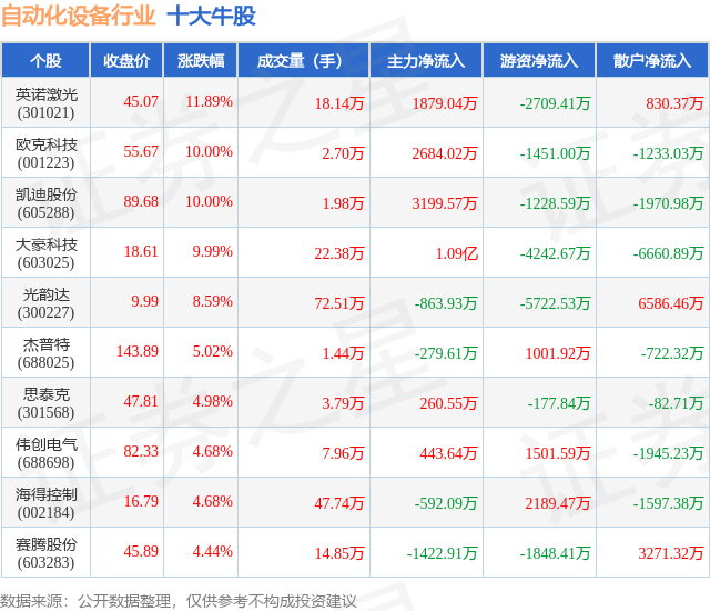 个股表现方面,自动化设备行业当日领涨股为英诺激光(301021),该股当日报收45.07,上涨11.89%,成交量18.14万,主力资金净流入1879.04万元。欧克科技(001223)以上涨10.0%紧随其后,该股当日成交量2.7万,主力资金净流入2684.02万元。除此之外,凯迪股份(605288)、大豪科技(603025)、光韵达(300227)均进入当日牛股之列。具体个股列表见下表: