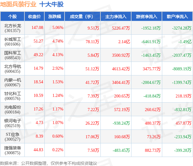 个股表现方面,地面兵装行业当日领涨股为北方长龙(301357),该股当日报收147.08,上涨5.06%,成交量9.51万,主力资金净流入5226.47万元。长城军工(601606)以上涨4.74%紧随其后,该股当日成交量78.11万,主力资金净流入2.14亿元。除此之外,国科军工(688543)、北方导航(600435)、内蒙一机(600967)均进入当日牛股之列。具体个股列表见下表: