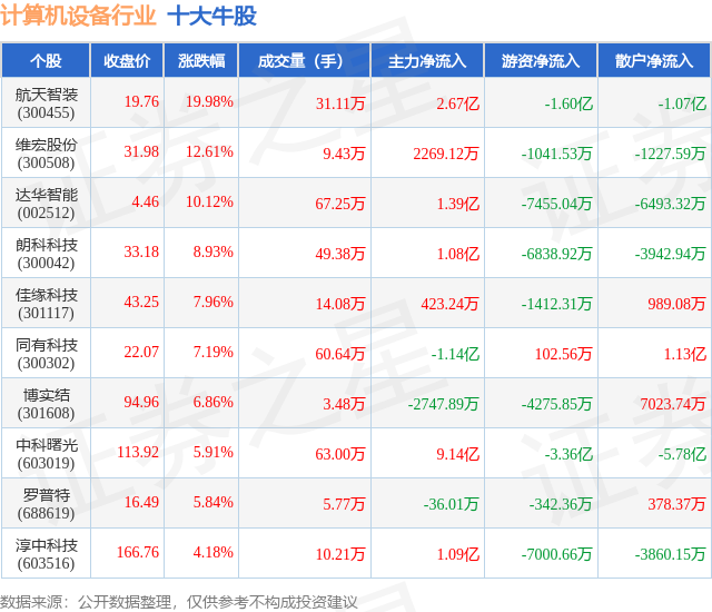 个股表现方面,计算机设备行业当日领涨股为航天智装(300455),该股当日报收19.76,上涨19.98%,成交量31.11万,主力资金净流入2.67亿元。维宏股份(300508)以上涨12.61%紧随其后,该股当日成交量9.43万,主力资金净流入2269.12万元。除此之外,达华智能(002512)、朗科科技(300042)、佳缘科技(301117)均进入当日牛股之列。具体个股列表见下表:
