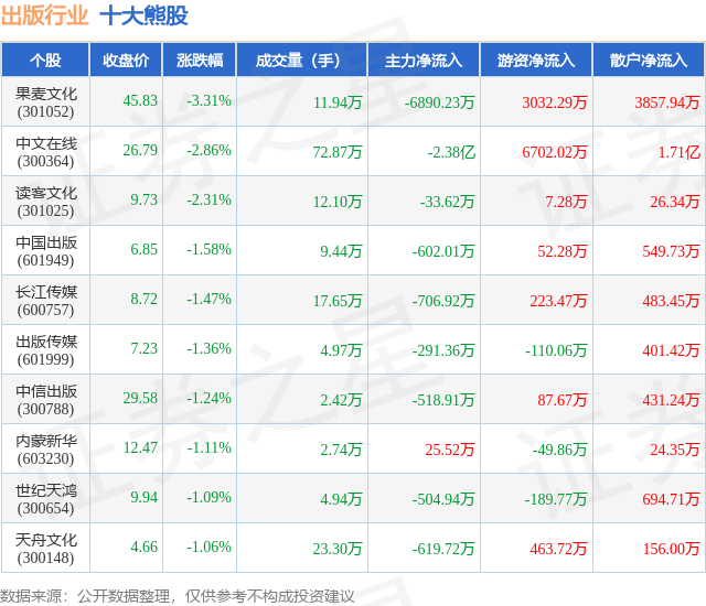 个股表现方面,出版行业当日领跌股为果麦文化(301052),该股当日报收45.83,下跌3.31%,成交量11.94万,主力资金净流出6890.23万元。中文在线(300364)以下跌2.86%紧随其后,该股当日成交量72.87万,主力资金净流出2.38亿元。除此之外,读客文化(301025)、中国出版(601949)、长江传媒(600757)均进入当日熊股之列。具体个股列表见下表: