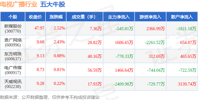 个股表现方面,电视广播行业当日领涨股为新媒股份(300770),该股当日报收47.97,上涨2.52%,成交量7.36万,主力资金净流出545.81万元。贵广网络(600996)以上涨2.43%紧随其后,该股当日成交量28.82万,主力资金净流入1606.65万元。除此之外,东方明珠(600637)、电广传媒(000917)、天威视讯(002238)均进入当日牛股之列。具体个股列表见下表: