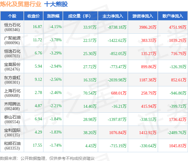 个股表现方面,炼化及贸易行业当日领跌股为恒力石化(600346),该股当日报收16.87,下跌4.15%,成交量33.97万,主力资金净流出8738.18万元。广聚能源(000096)以下跌3.78%紧随其后,该股当日成交量22.57万,主力资金净流出1422.62万元。除此之外,恒逸石化(000703)、宝莫股份(002476)、东方盛虹(000301)均进入当日熊股之列。具体个股列表见下表: