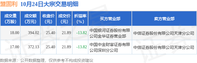 证券之星消息,10月24日盟固利发生大宗交易,交易数据如下: