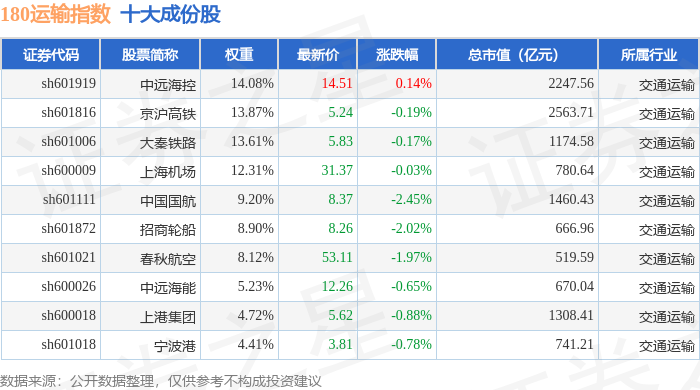 证券之星消息,10月24日,180运输(000027)指数报收于764.4点,跌1.53%,成交57.82亿元,换手率0.4%。当日该指数成份股中,上涨的有2家,山东高速以0.87%的涨幅领涨,下跌的有10家,中国国航以2.45%的跌幅领跌。