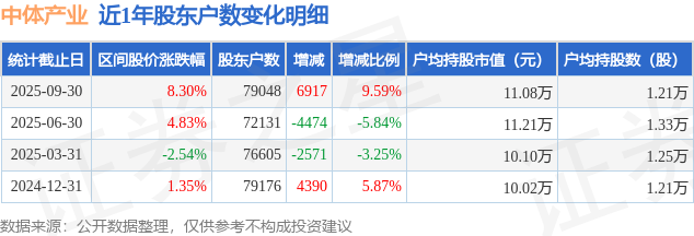 从股价来看,2025年6月30日至2025年9月30日,中体产业区间涨幅为8.3%,在此期间股东户数增加6917.0户,增幅为9.59%。