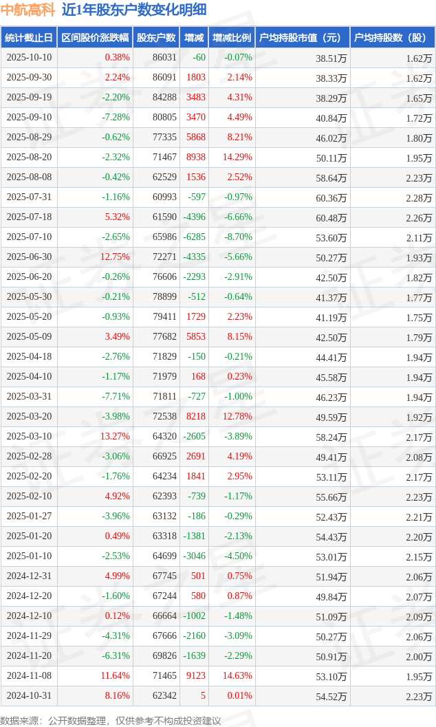 从股价来看,2025年9月30日至2025年10月10日,中航高科区间涨幅为0.38%,在此期间股东户数减少60.0户,减幅为0.07%。